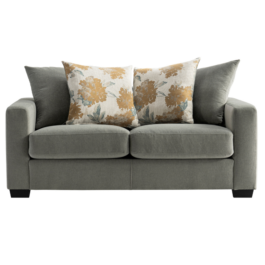 Get comfort in our trendy and unique Emily Loveseat Sofa, with its lively design, sleek material and modern style. With plush grey fabric and charming gold patterned cushions, this cozy and charming 2-seater by Roots Furniture is definitely what you need in your home.