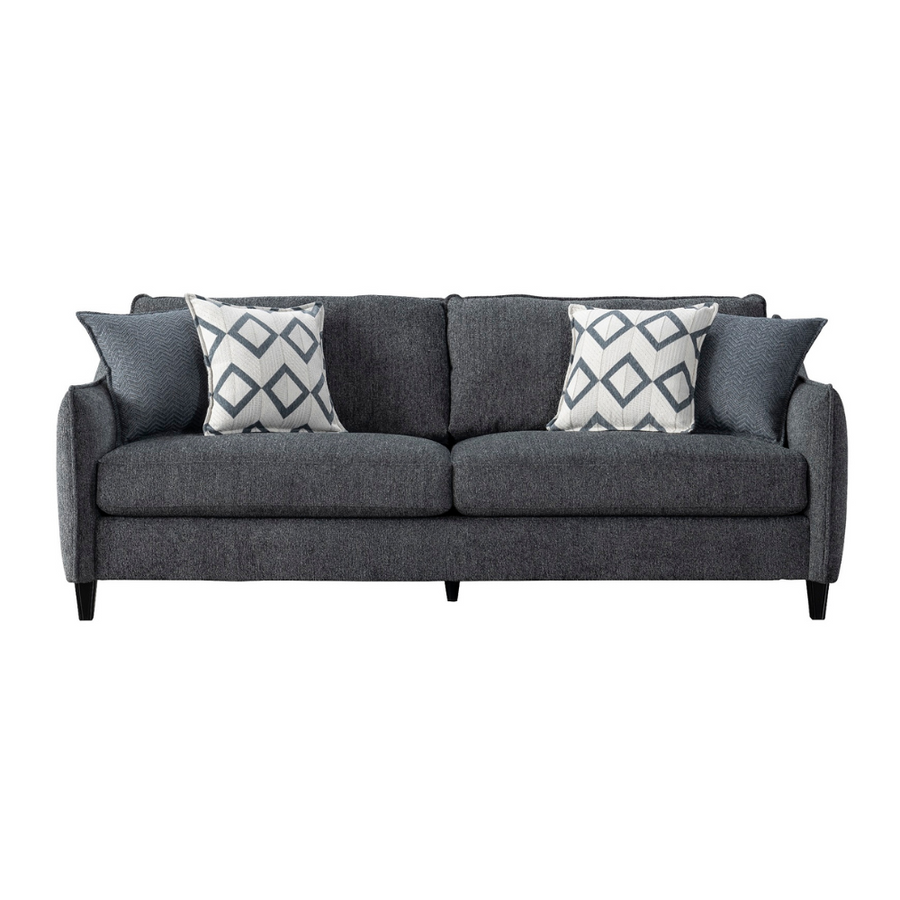 If you're looking for elegant and versatile living room furniture, look no further than the modern Darkdust Sofa by Roots Furniture! This charming dark grey 3-seater comes with a stylish white geometrically patterned cushion and plush padded seats.