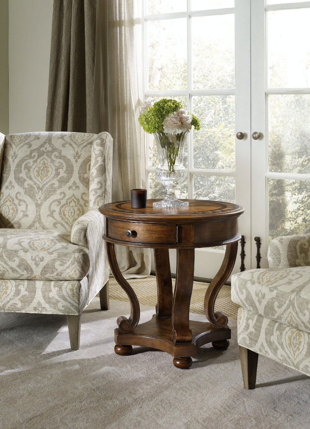 Distinguished by shaped, French Provincial-inspired legs above a base elevated by chic bun feet, the Archivist Round Accent End Table has a world-traveled pedigree with an updated twist. The soft, casual Pecan finish offers a rustic authenticity, and the beautiful patterned ebony veneers on the top edge are a designer touch. One drawer and one shelf.