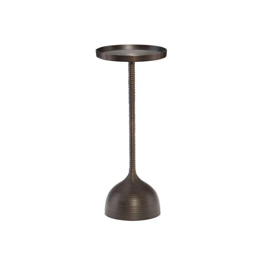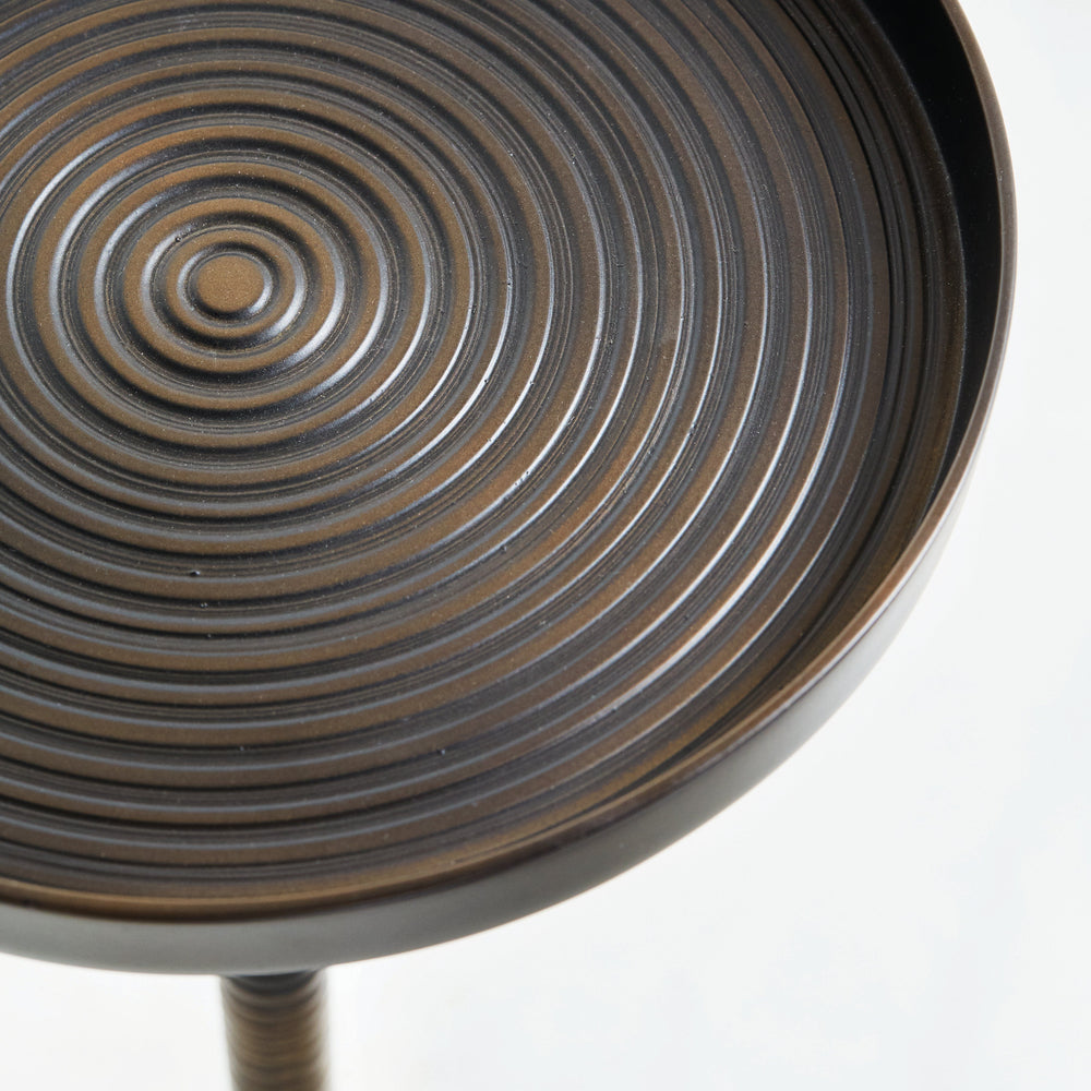 Sculptural and unique, the Cordoba round chairside table is crafted from cast aluminum in a bronze finish. The gallery top features an unadorned rim and a surface etched with a bull’s-eye pattern. The circles continue along the slender pedestal and dome-shaped base, adding texture and visual appeal.