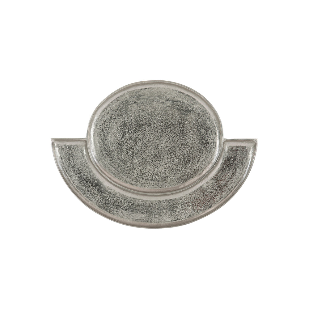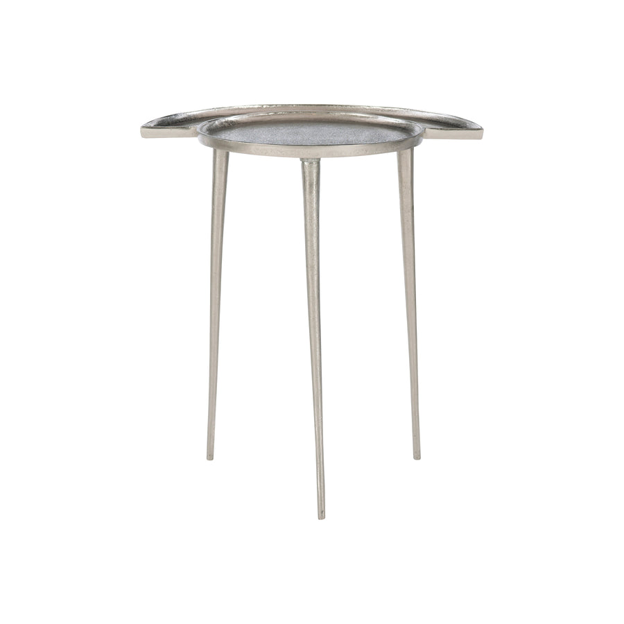 Fine craftsmanship and modern styling characterize the eclectic Bernhardt Interiors collection. Crafted from cast aluminum in a nickel finish, the Dayle accent table offers artistic style with a hint of shine. On the top, two trays connect in a simple geometric design. Three slender tapered legs achieve a minimalist aesthetic with a delicate touch.
