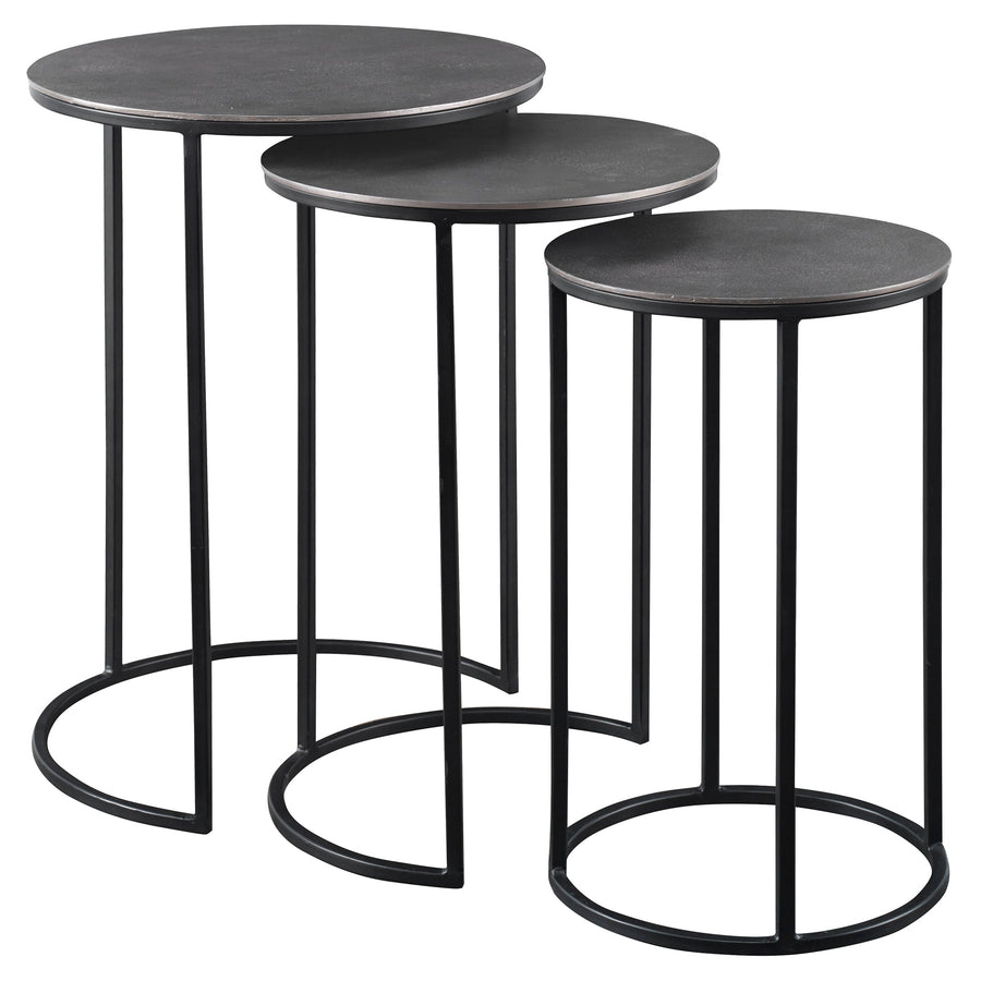 Set Of Three Functional Nesting Tables Constructed In An Aged Black Iron, Featuring A Textured Cast Aluminum Slab Top Finished In A Plated Antique Nickel. Sizes: S-12"x20", M-14"x22", L-17"x24"