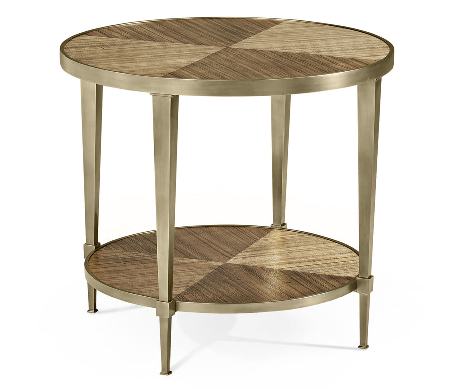 Informed by the symmetry and balance of classic forms, this table features quartered paldao veneer under a light, transparent lacquer finish. Frame is acid dipped, hand rubbed brass with a rich, natural patina.