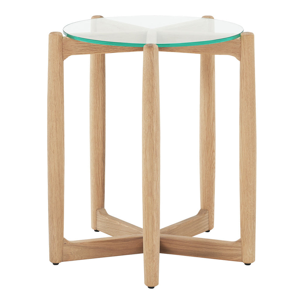 Slender and serene, the Hetta side table’s circular shape will create a calming flow in your space. Its five-pointed base made from solid oak is only the beginning with this beauty, as its subtly sculpted touches rise above the rest. A window into leisurely gatherings, the tempered glass tabletop is a showcase for the detailed woodgrain, as well as a reflective expansion for your space. Pair Hetta with your favorite accent chairs and sofa as a tranquil focal point.
