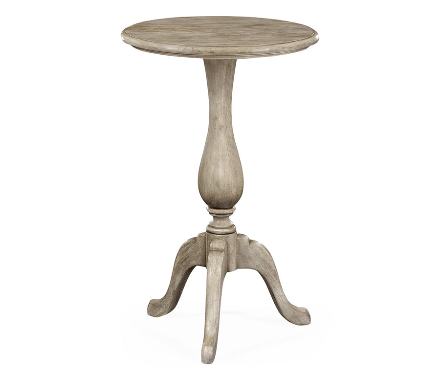 Tall round cocktail table with balustrade support in a rustic grey finish.