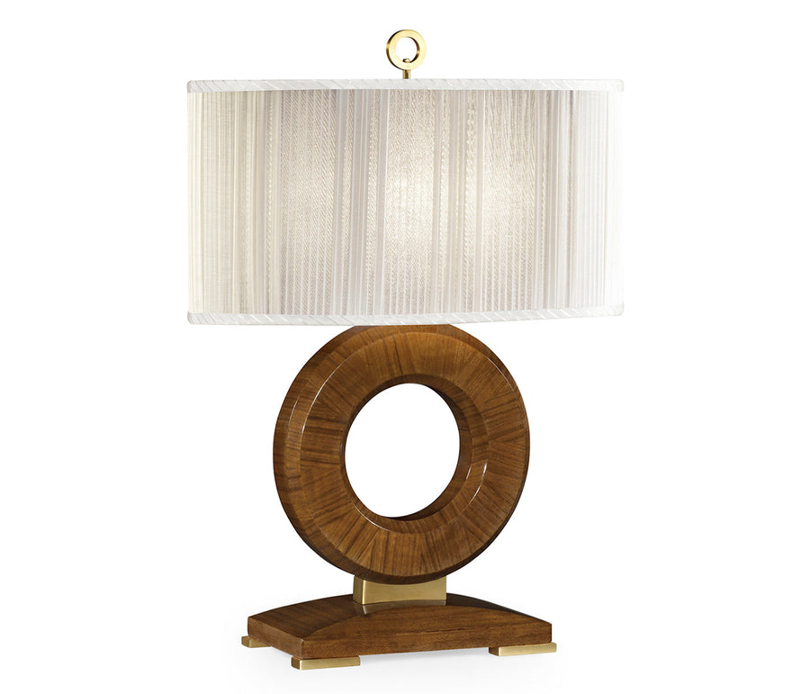 Contemporary table lamp with circular porthole in hyedua veneer and brass details, with an oval textured silk shade. (Old salescode: 495461)