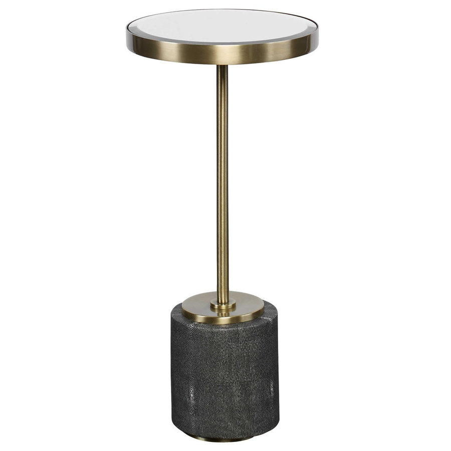 Stylish and sophisticated, this round accent table features a gray faux shagreen base paired with an iron support in rich brushed brass and a beveled mirror top.