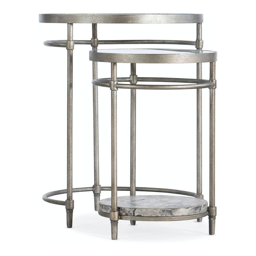 Opulent, yet approachable, timeless, yet modern, these striking nesting tables are crafted of concrete, metal and glass with a champagne-colored metal frame and concrete in a gray and black pattern. Both tables have glass tops, and the smaller table has a concrete bottom shelf and slides beneath the larger table.