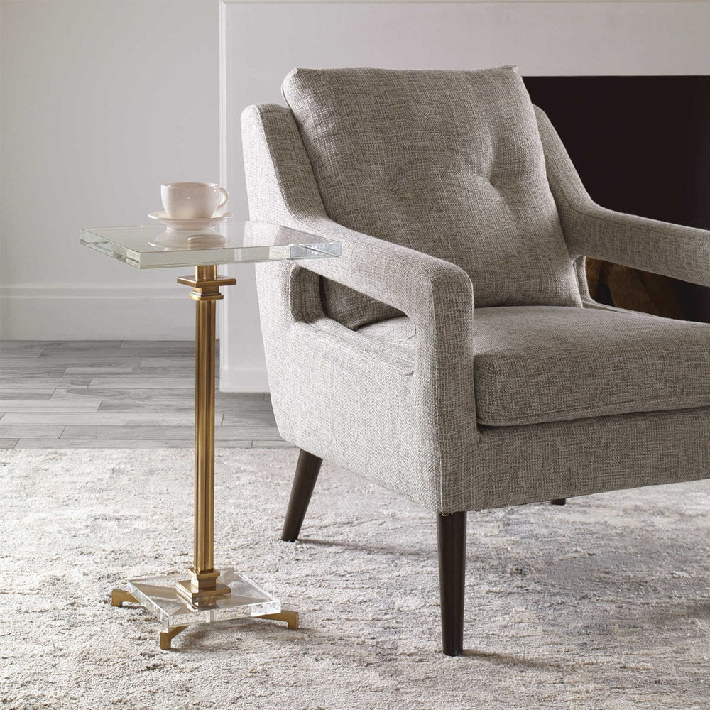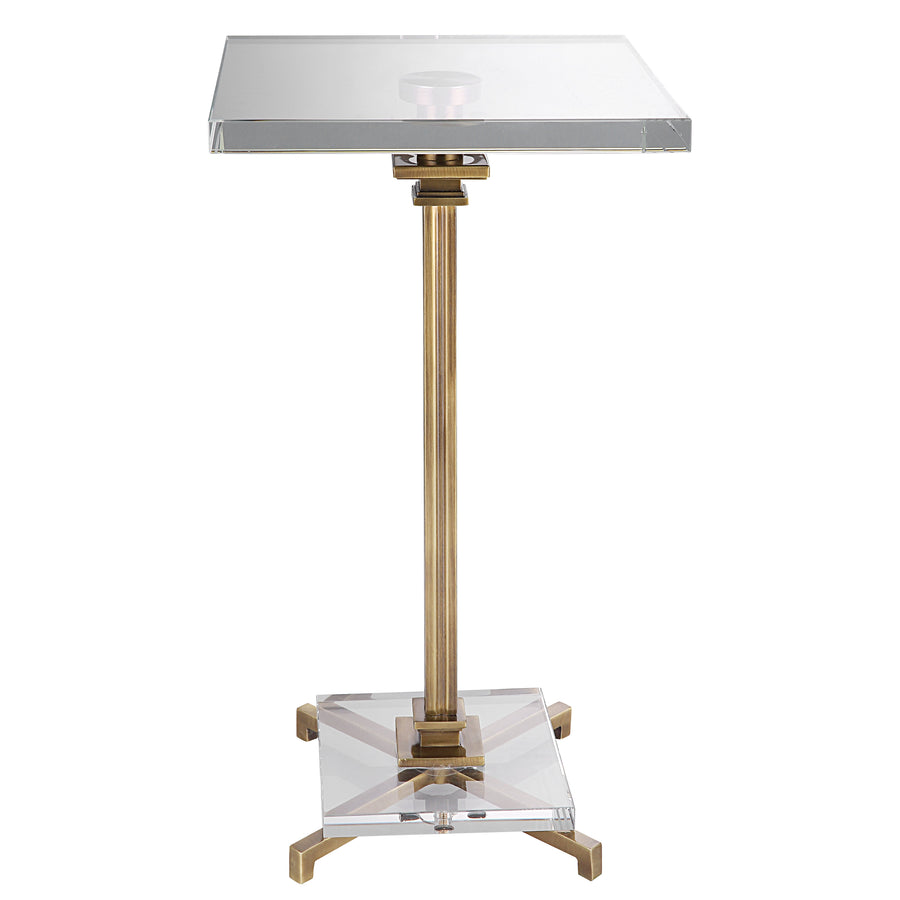 Streamlined with updated traditional style in mind, this petite drink table features a thick crystal top and coordinating accents on the base, finished in brushed brass plating.