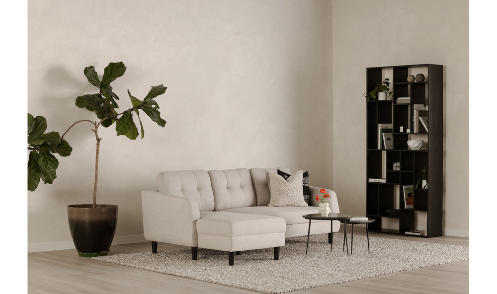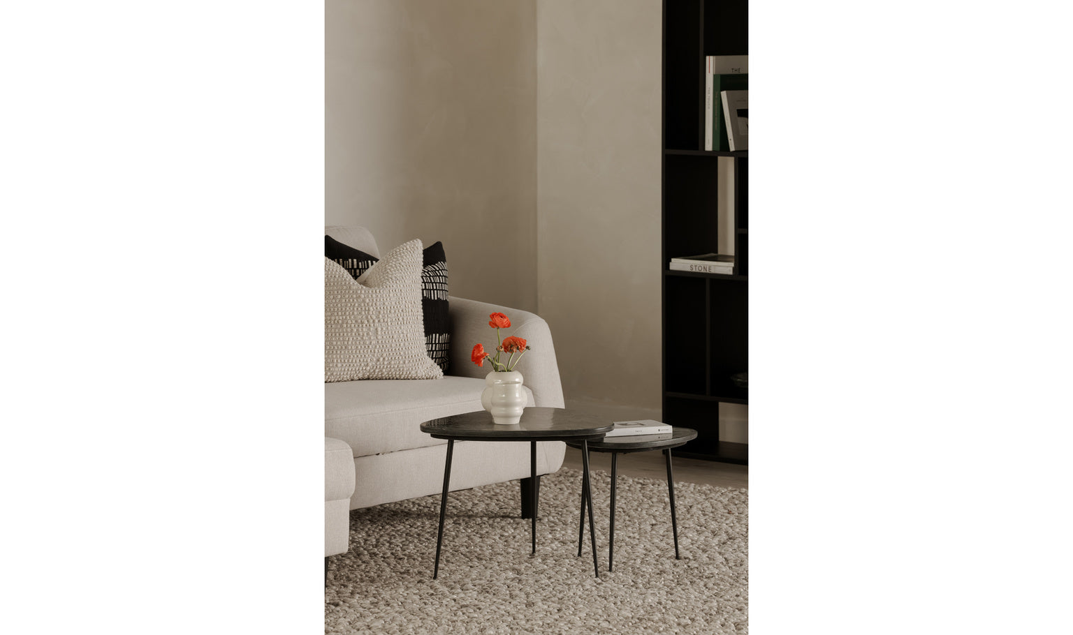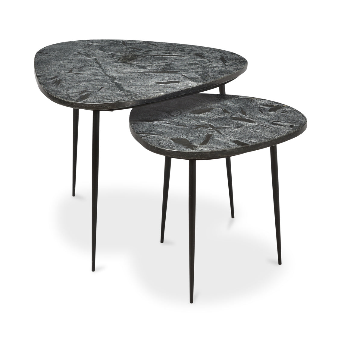 Mid-century design meets modern convenience. The Rigby nesting tables are standout modular pieces here to offer up chic sophistication for your living space. The tabletops are a glorious black marble with a tactile texture that is utterly unique. Three slender iron legs taper out to a graceful point while a play of shape and texture will have even the smallest of spaces come to life with this subtle design's quirkiness. Save your space and tuck away with ease, these nesting tables are optimal for smaller living spaces.