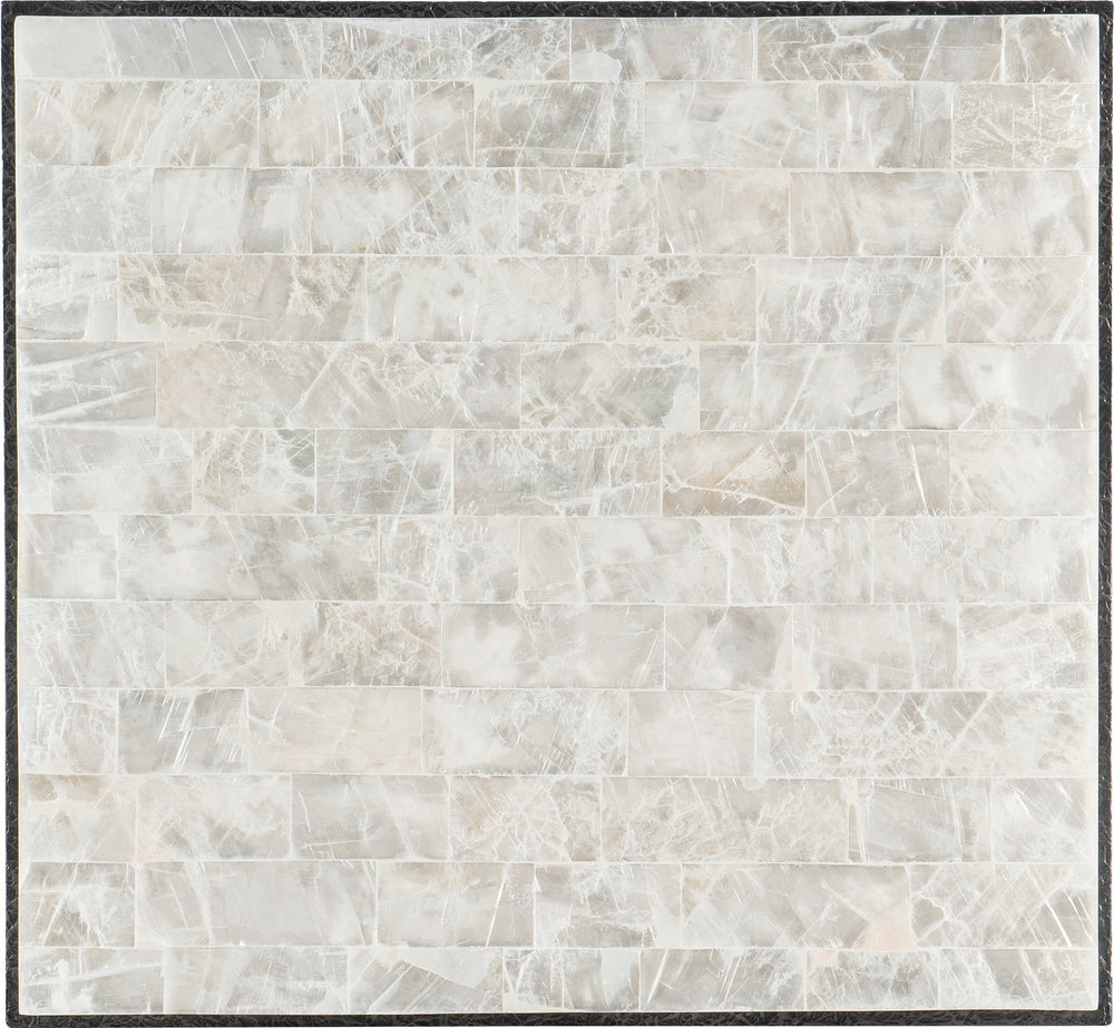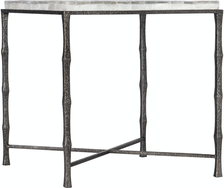 A delightful medley of natural materials and organic color tones, the versatile Surfrider End Table has a Gypsum top in a multicolored blend of whites, creams and beiges and 4 charcoal-colored distressed metal legs joined by an X-stretcher.
