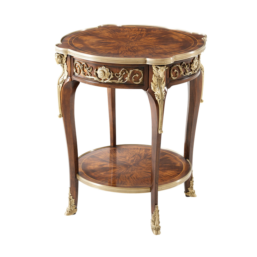 A fine mahogany and morado crossbanded lamp table, applied with very fine brass mounts, the brass bound circular top and undertier with protruding corners and a frieze drawer, on cabriole legs.