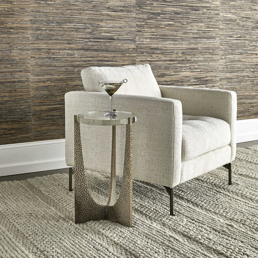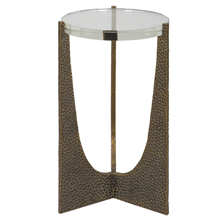A thick crystal top is on display, secured with prongs like a diamond ring. The sleek, minimal-profile base is made of hammered steel, finished in a golden bronze.