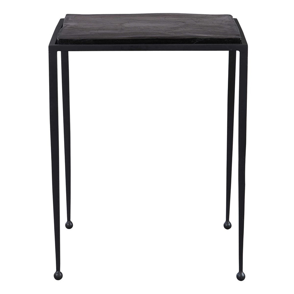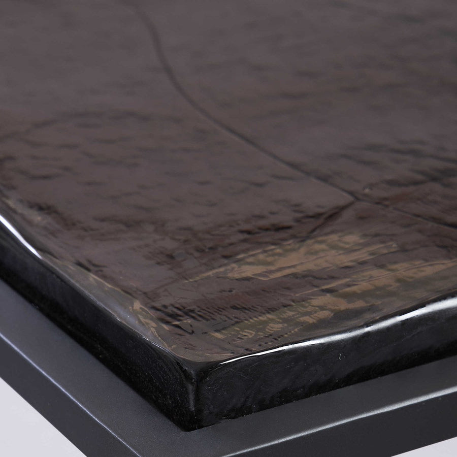 Featuring a beautiful cast glass top in textured charcoal that is nestled into a solid iron tapered frame in matte black, accented with petite ball feet.