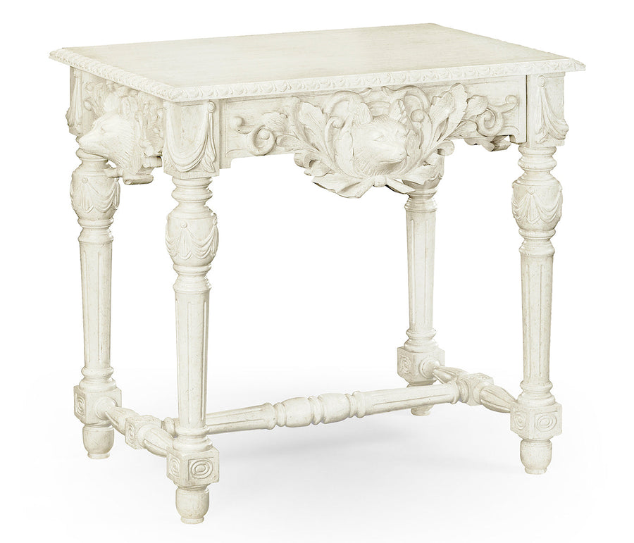 The Godwyn side table is a piece in this collection which I truly marvel at. The amusing fox heads, hand-carved amongst leaves and foliage, make for a pleasing and yet frivolous atmosphere. The front of the table, being a drawer, makes this piece suitable either by the sofa or by the bed. It's important to occasionally add humour to a decorative scheme.