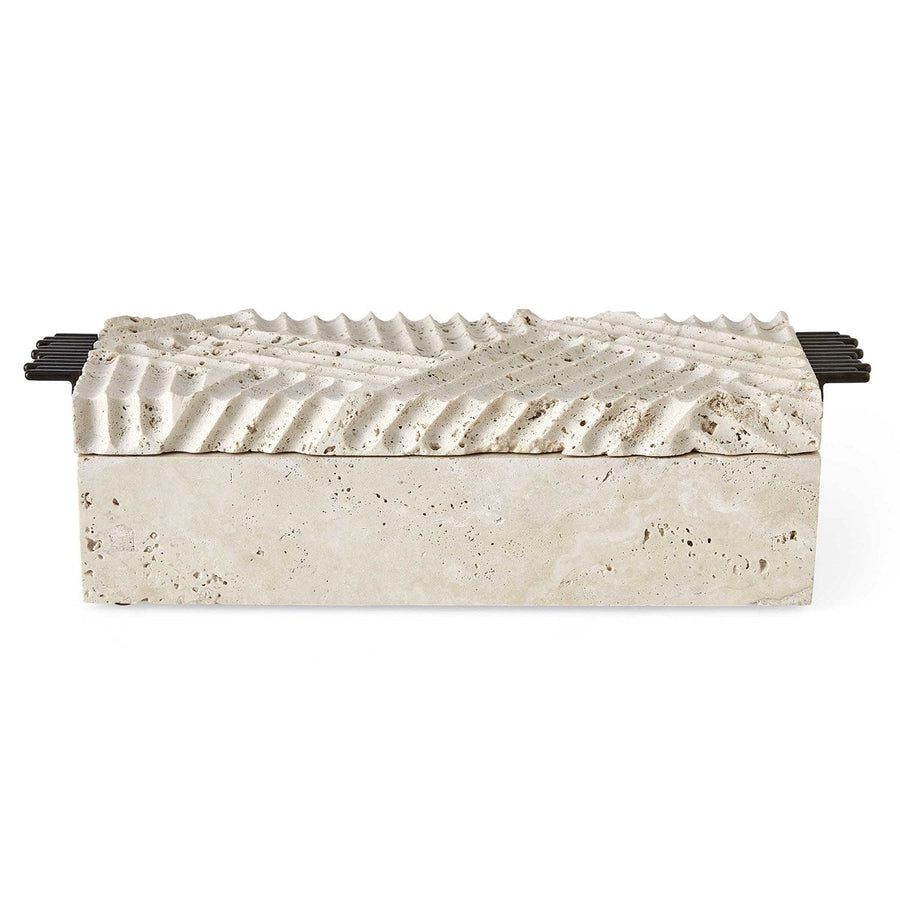 Unfilled beige travertine is carved first by waterjet then by hand, giving this box the look of an ancient, artisan work. The lid carries an abstract motif. Bronzed brass handles have the practical benefit of being easy to lift.