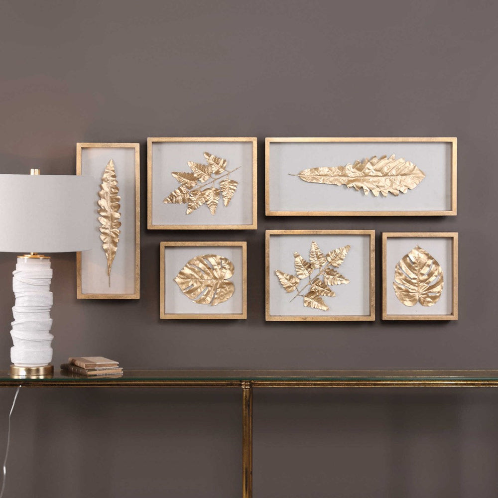 A Leaf Collection Study, Cut From Silk Fabric With Gold Leaf Overlay, On A Natural Linen Backing Showcased In Wooden Shadow Boxes Finished With Gold Leaf, All Under Glass. May Be Hung Horizontal Or Vertical.