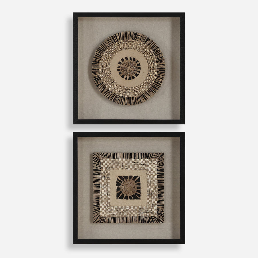 The Intertwine shadow boxes are woven together like an heirloom tapestry. Featuring knit paper dyed in natural earth tones over a beige linen backing and framed in satin black finished pine wood.