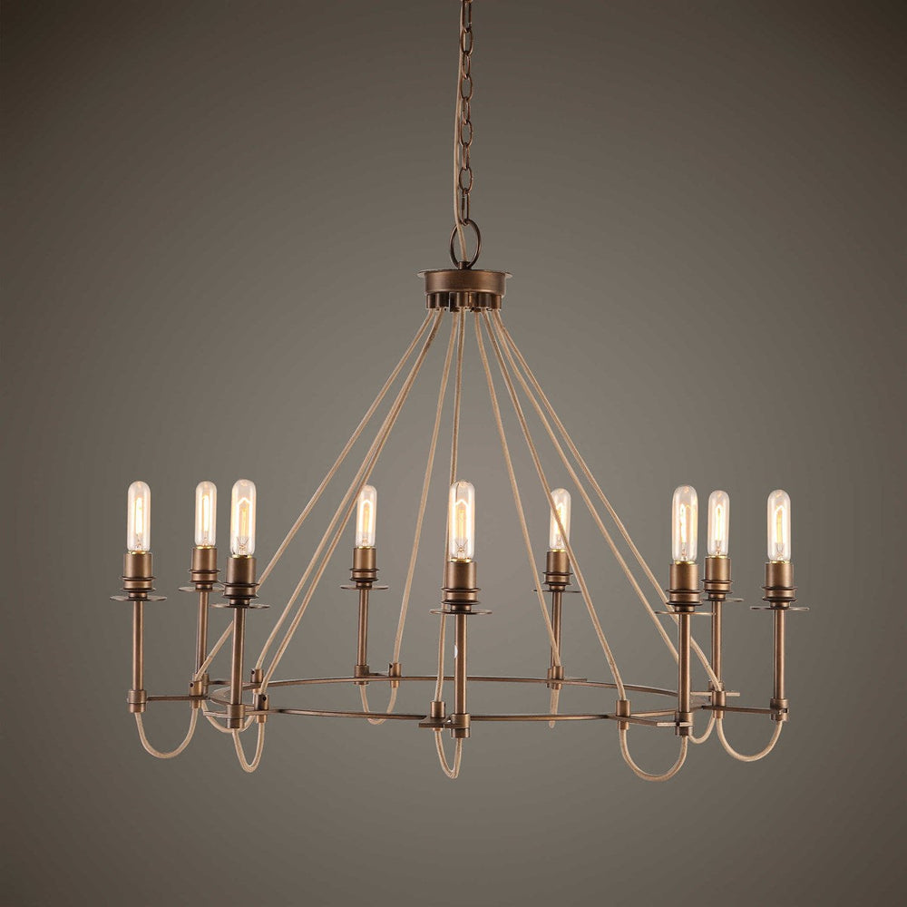 Rich Urban Industrial Style 9 Lt. Chandelier. Featuring A Warm Light Oil Rubbed Bronze Finish With Beige Cloth Covered Cord Supports. Includes 9-60 Watt Max Edison Sockets. Supplied With 15' Wire And 7' Chain For Adjustable Installation.