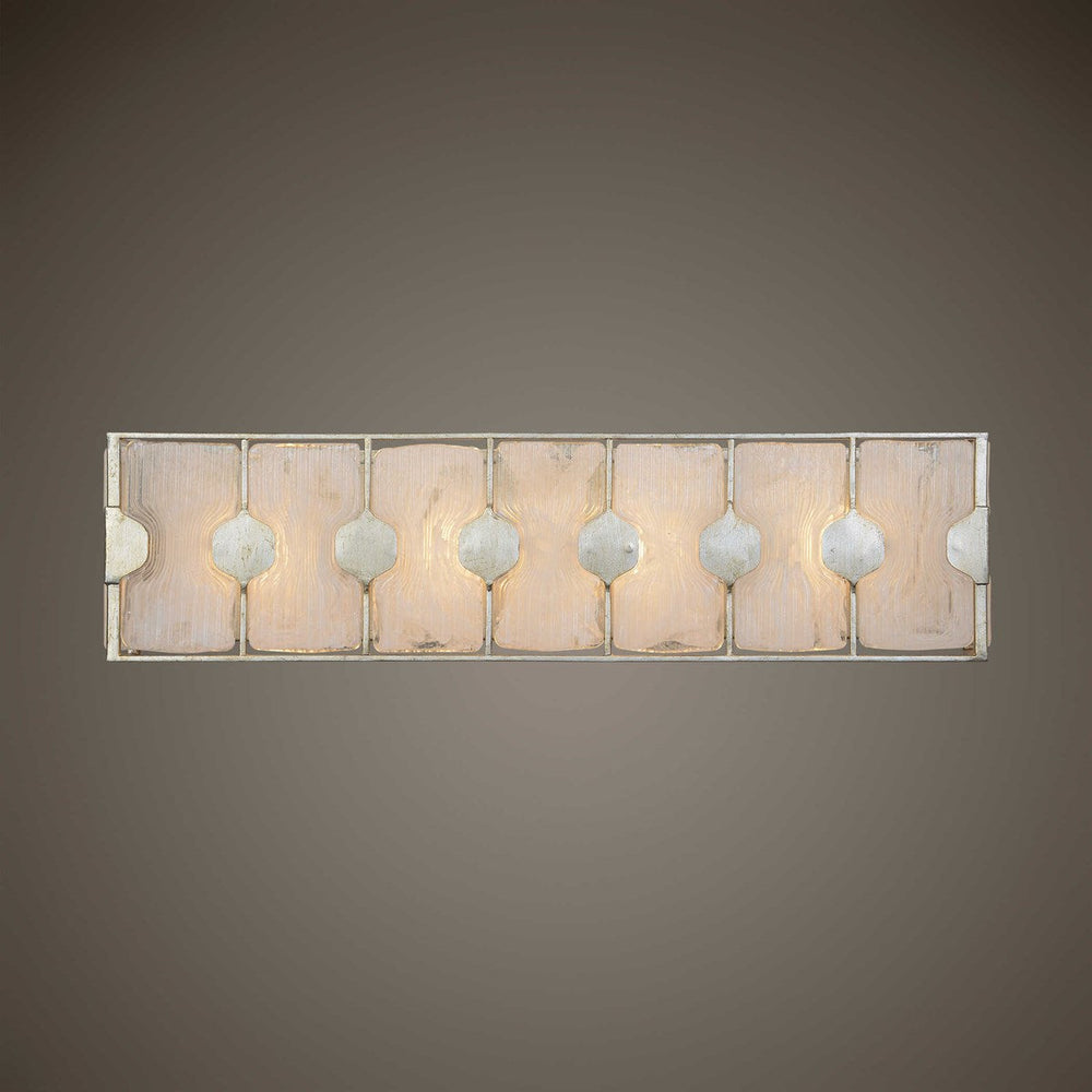 A classic 4 Lt. bath vanity fixture with exquisite handmade white swirl glass panels with pressed hourglass contours and peacock feather metal ornaments anchoring each glass. A transitional design with roots from the Art Deco period. 4-60 watt max, Edison sockets. Bulbs not included.