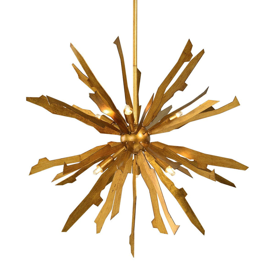 Antique gold leaf on starburst blades helps mix the mid-century feel with an old world feel giving us this great pendant. 6-40 watt max, G9 sockets. Bulbs not included. Supplied with 15' wire & 5' chain for adjustable installation.