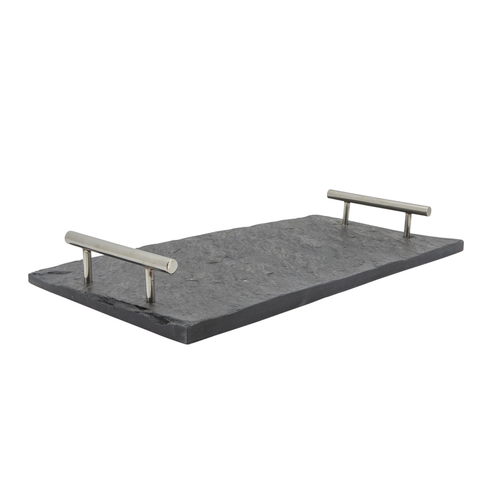 MARBLE 18X9 SLATE TRAY W/ SILVER HANDLE, BLACK