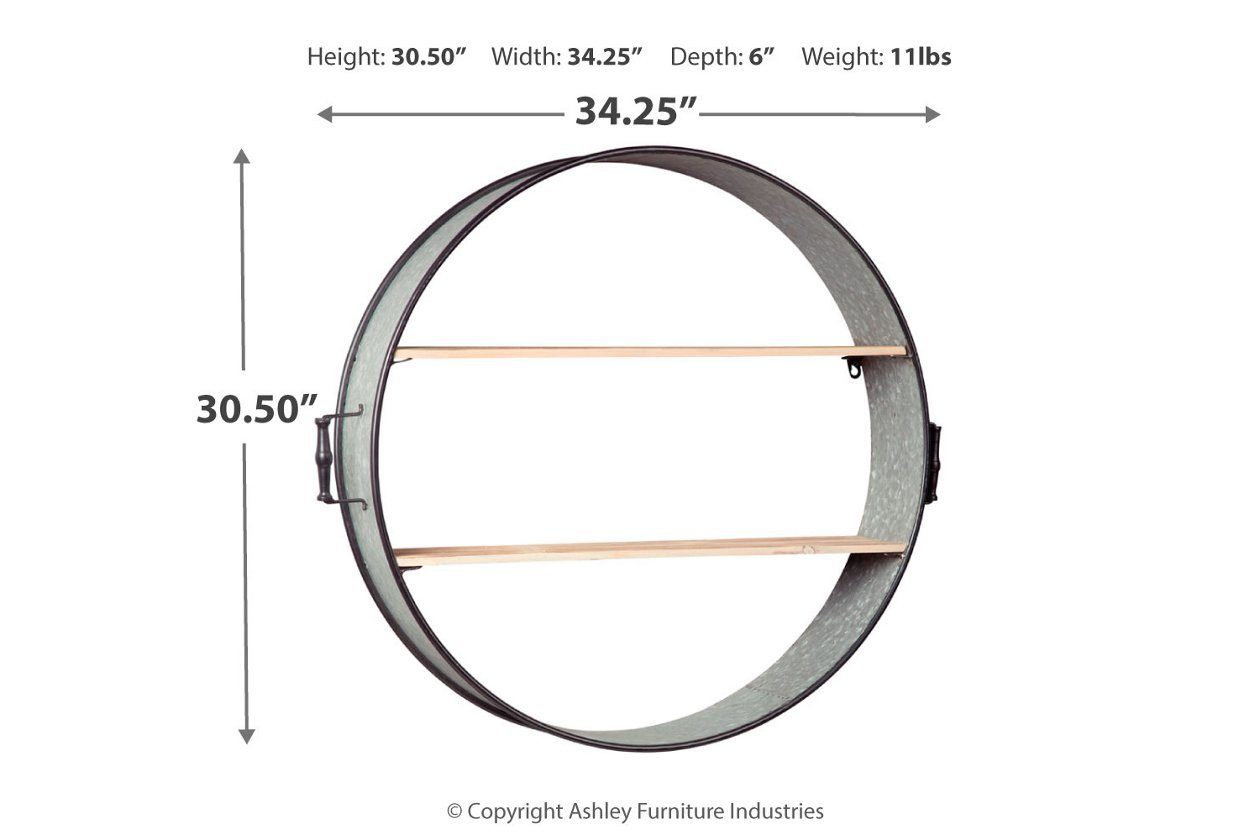 Create extra show-off space by hanging up the Eirny wall shelf. Its generously scaled barrel design with wooden shelves puts your decor on display with style. Galvanized metal adds an industrial feel to the look.