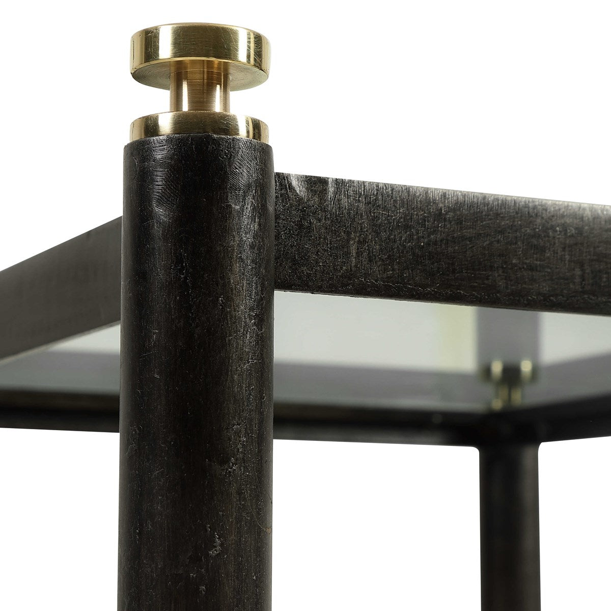 Made of steel with a dark bronze finish, solid brass feet and finials, the Viceroy etagere has a polished black and white marble bottom shelf and four clear tempered glass shelves. The updated classic design and mix of finishes allow the table to work in almost any style room. The diminutive size makes it a great fit for many locations including small baths, halls, or grouped in multiples in a larger room. Because of the natural characteristics of marble, each piece will have unique veining patterns.