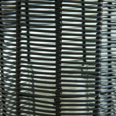 Complete the look of your restful retreat with the homey Evonne lantern. Its black faux rattan filters the light of your candle (not included) to give a gentle glow to your space. When not in use, this chic indoor/outdoor piece rounds out your decor with its versatile style.
