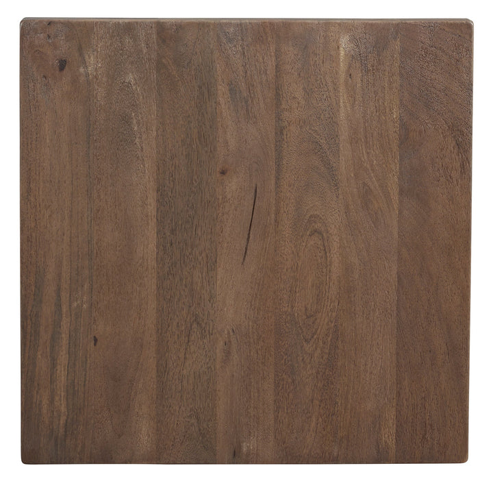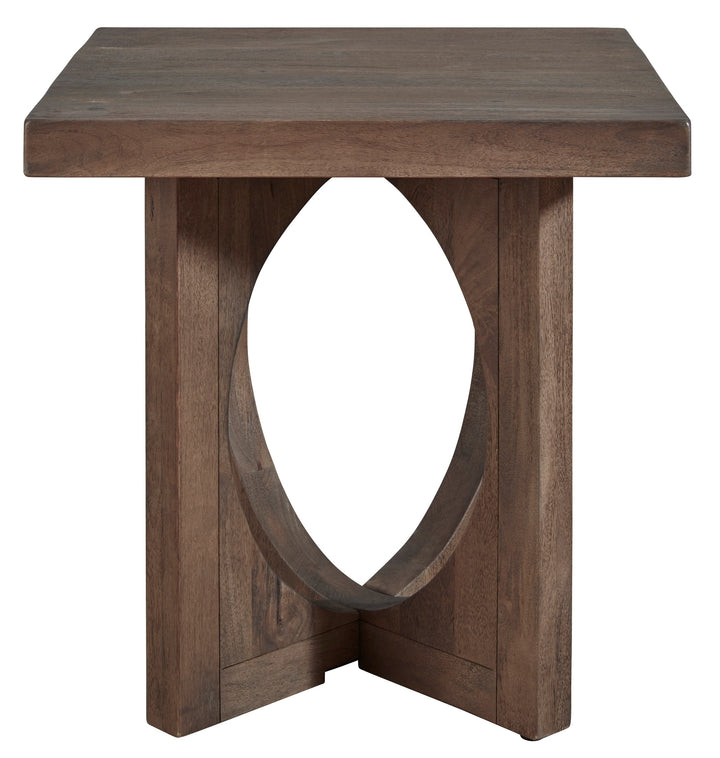 Pique your visual interest with the Abbianna end table. In a medium brown finish, this sculptural piece is part art form, part everyday function. The chunky “X” base with circular cutouts wows with geometric style, supporting lamps, decor or everyday essentials with forward-thinking flair.