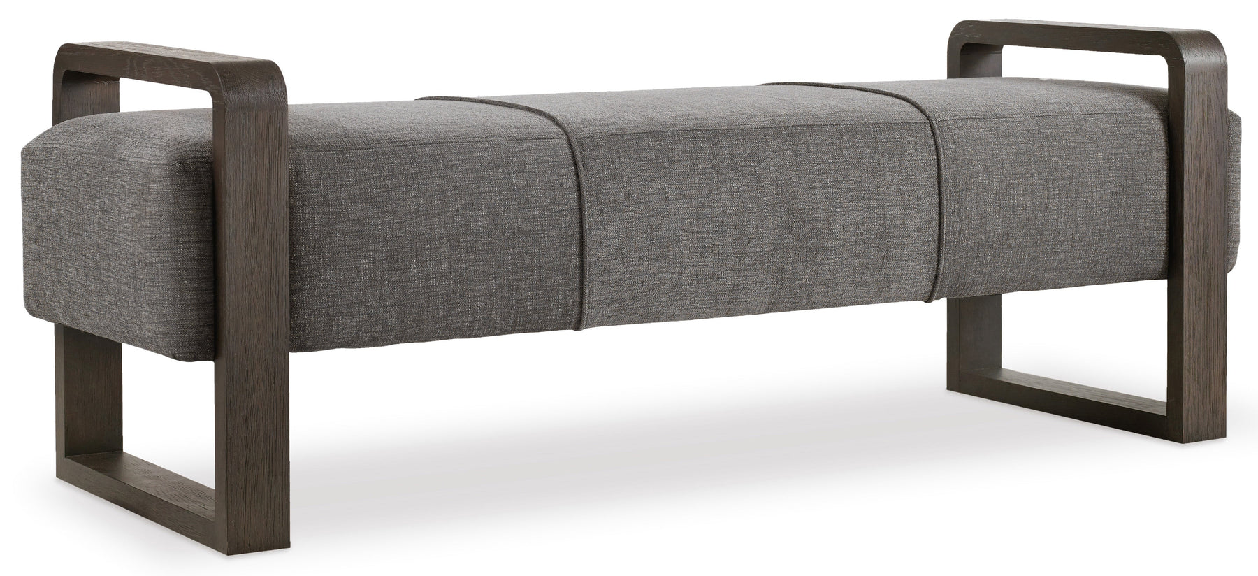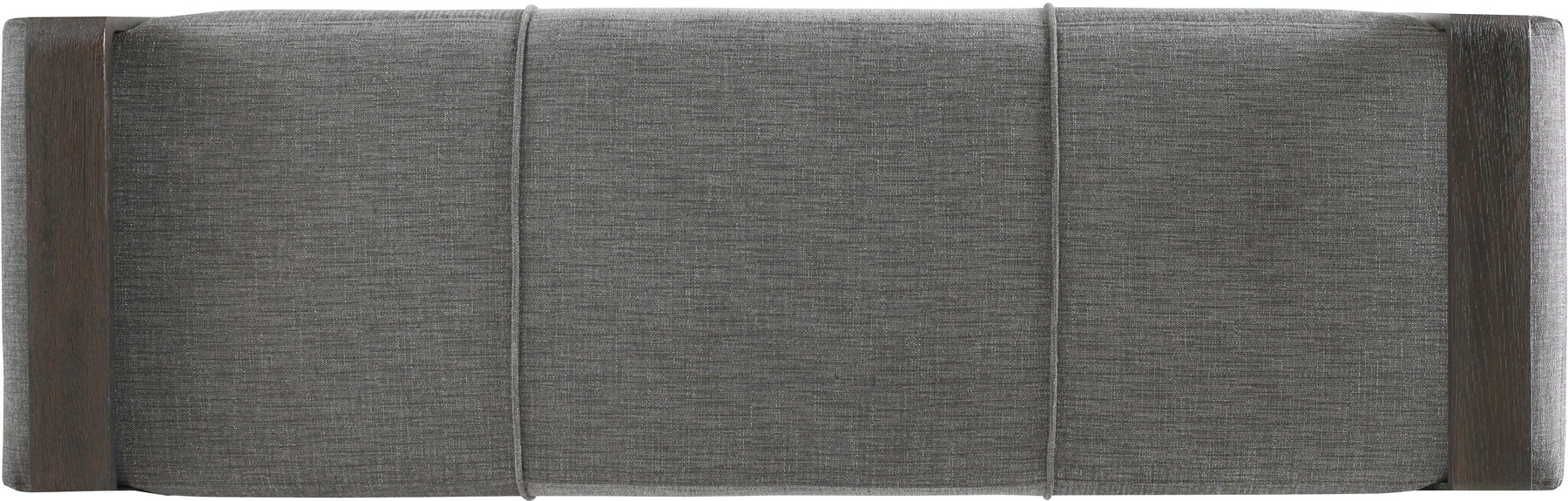 Chic, modern and inviting, the graphite gray upholstered seat of the Curata bench appears to be floating between the softly rounded rectangle ends finished in the deep brown Midnight.