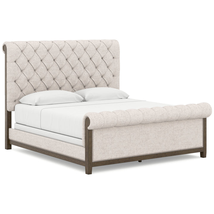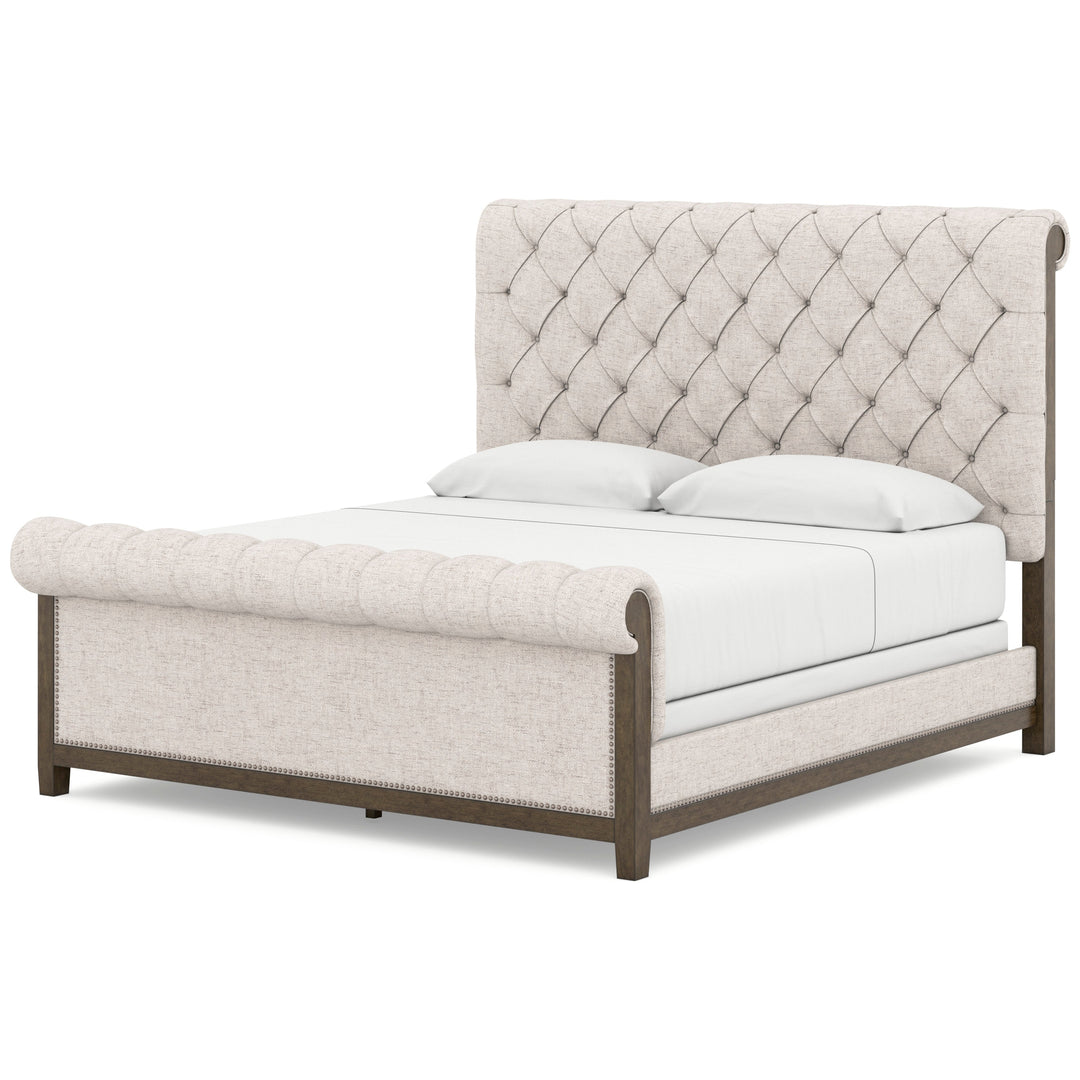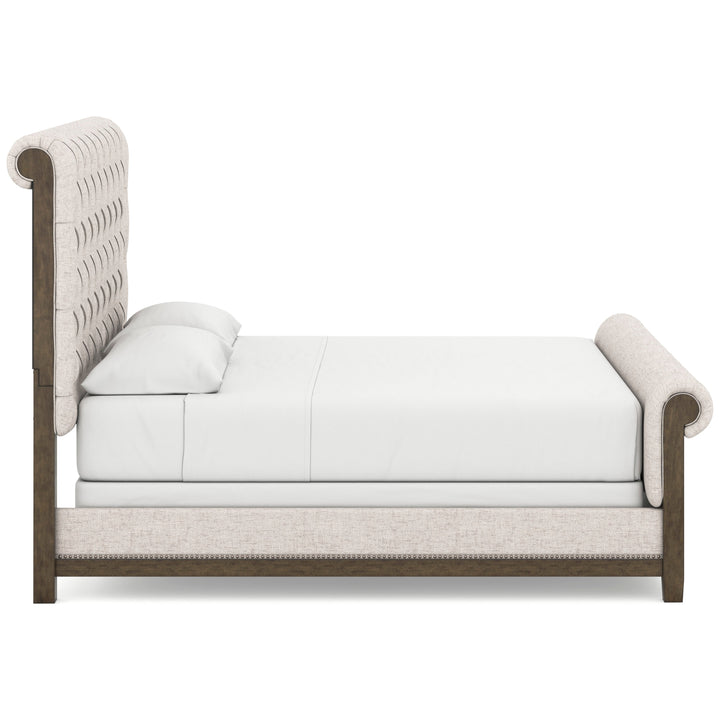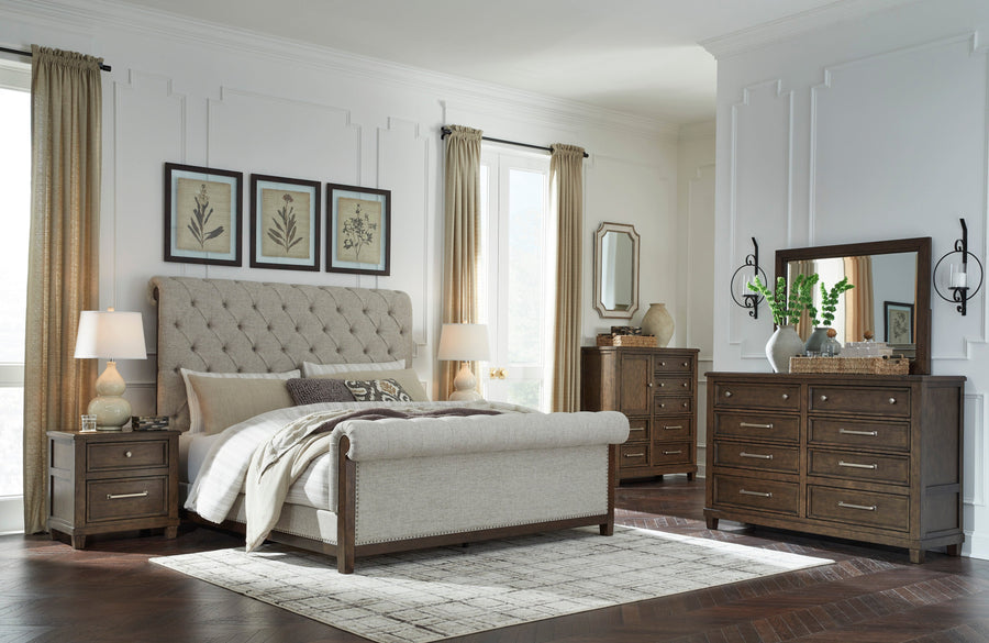 With its rich dark brown wood finish, the Hillcott set gives modern farmhouse styling a substantial sensibility. Exaggerated rolled tops on the headboard and footboard are elevated with beautiful tufting and nailhead trim. Subtle touches elevate this bed into a statement piece that’s timeless, functional and versatile.