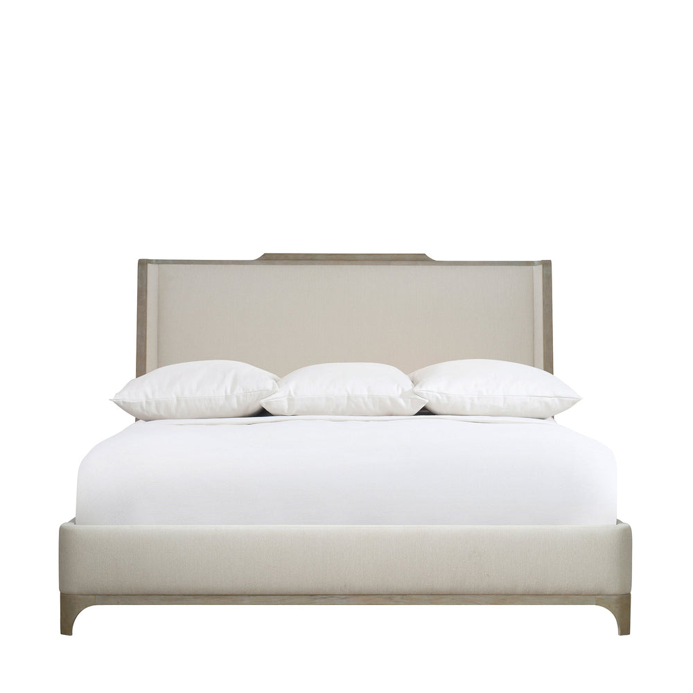 The shapely silhouette of the Albion King bed takes inspirational cues from the wingback chairs. Guarding the headboard and footboard are the sweeping wood lines in Pewter finish. The upholstered footboard with a wood base truly complements the wide and tall upholstered headboard, keeping aesthetics tied.