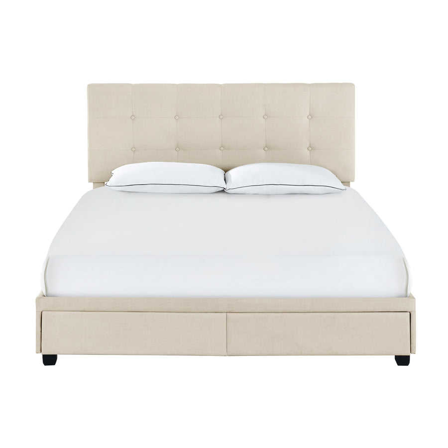 Modern and contemporary styled rectangular headboard silhouette with biscuit tufting.,Upholstered storage footboard,Lightly textured polyester fabric is soft to the touch and easy to clean,Hardware kit included,Wooden slat roll with support legs for box spring & mattress support,Assembly is required; two people are recommended to complete bed setup in 90 minutes