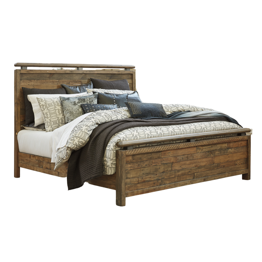 Load up on character. Scale back on fuss. As the Sommerford king panel bed proves to perfection—less is more. Crafted of reclaimed pine, its ultra clean-lined, chunky profile showcases long butcher-block planking rich with tonal variation, nicks, notches, nail holes and a whole lot of raw beauty.