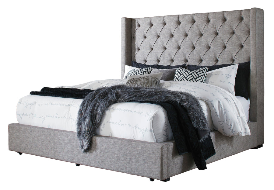 Sleeping beauty. From its button-tufted mansion-wing headboard, to its storage footboard that seamlessly merges form and function, the Sorinella upholstered king bed with storage is heavenly from head to toe. This high-style favorite includes a generously sized drawer at the foot of the bed that’s perfect for linens, blankets and throws. Linen-weave gray fabric with warm brown undertones is sure to set a soothing mood for your bedroom retreat. Mattress available, sold separately.