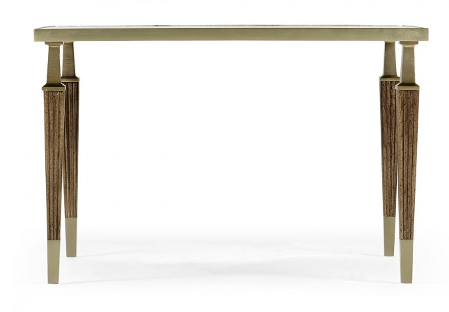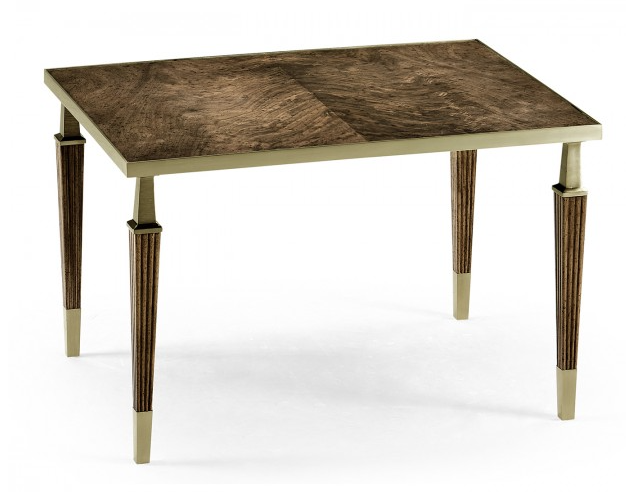 Influenced by classic Spanish forms, the tops feature traditional, book matched, walnut swirl veneer, with a transparent, low luster finish. Legs are fabricated from stainless steel with a light champagne patina.