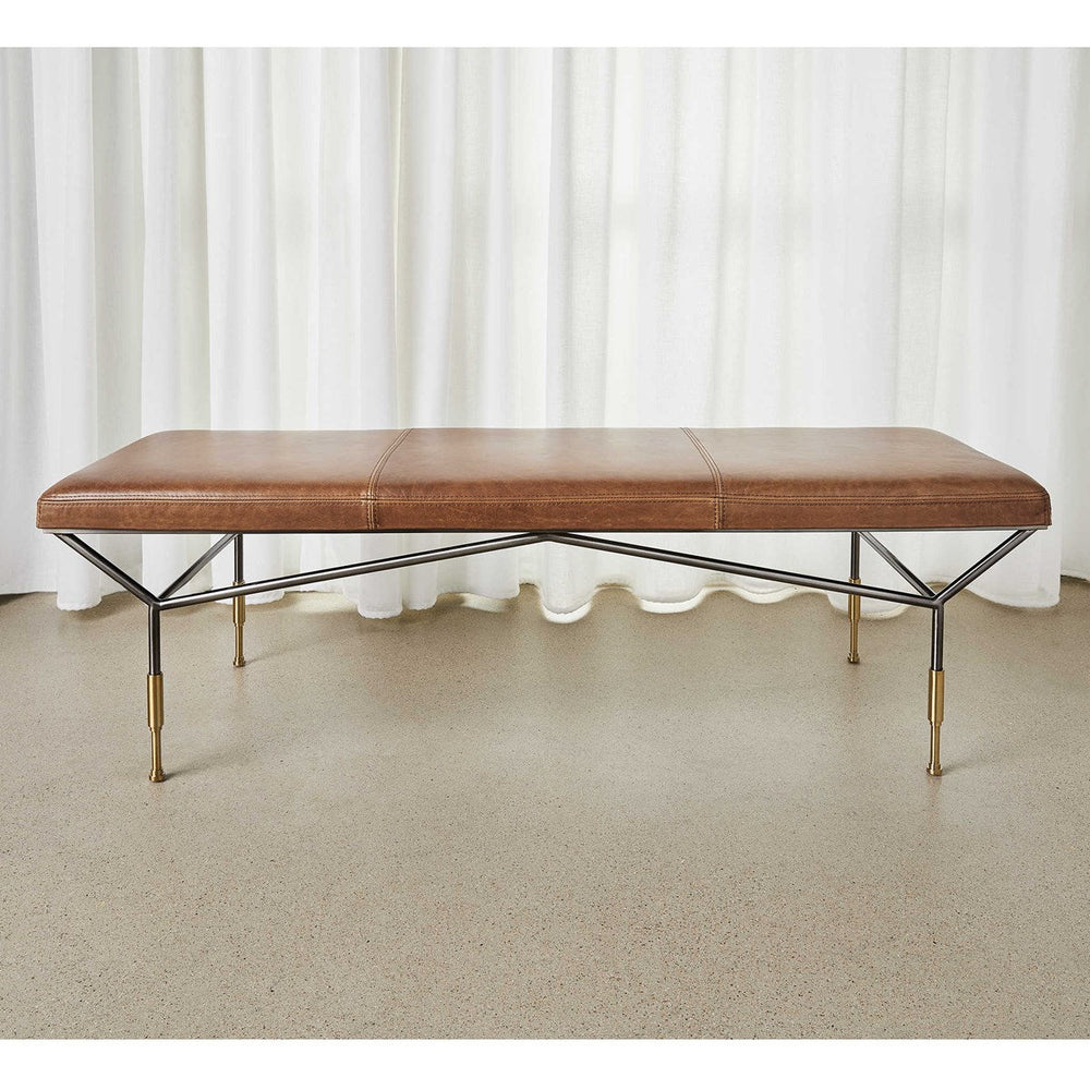 The Bridge Bench is engineered for function and beauty. Made of stainless steel with solid brass feet, and hand dyed 57-inch long leather box cushion in a warm whiskey color. Because leather is a natural product, both texture and color will vary slightly from hide to hide and within the same hide. Seat height is 18".