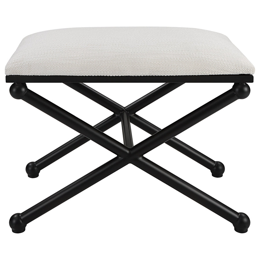 With classic simplicity, this small bench features a smooth iron base finished in satin black, upholstered in a crisp textured white polyester.