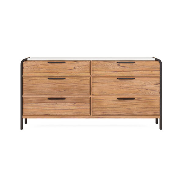 High contrast minimalism meets luxurious mixed materials in this collection, inspired by the bold confidence of contemporary art and fashion. This six drawer dresser features a two-tone look combining a white top and beautifully grained wood with chic curves and overscale horizontal pulls in matte black. The lower drawers are lined in aromatic cedar, providing a storage piece that effortlessly combines form and function.