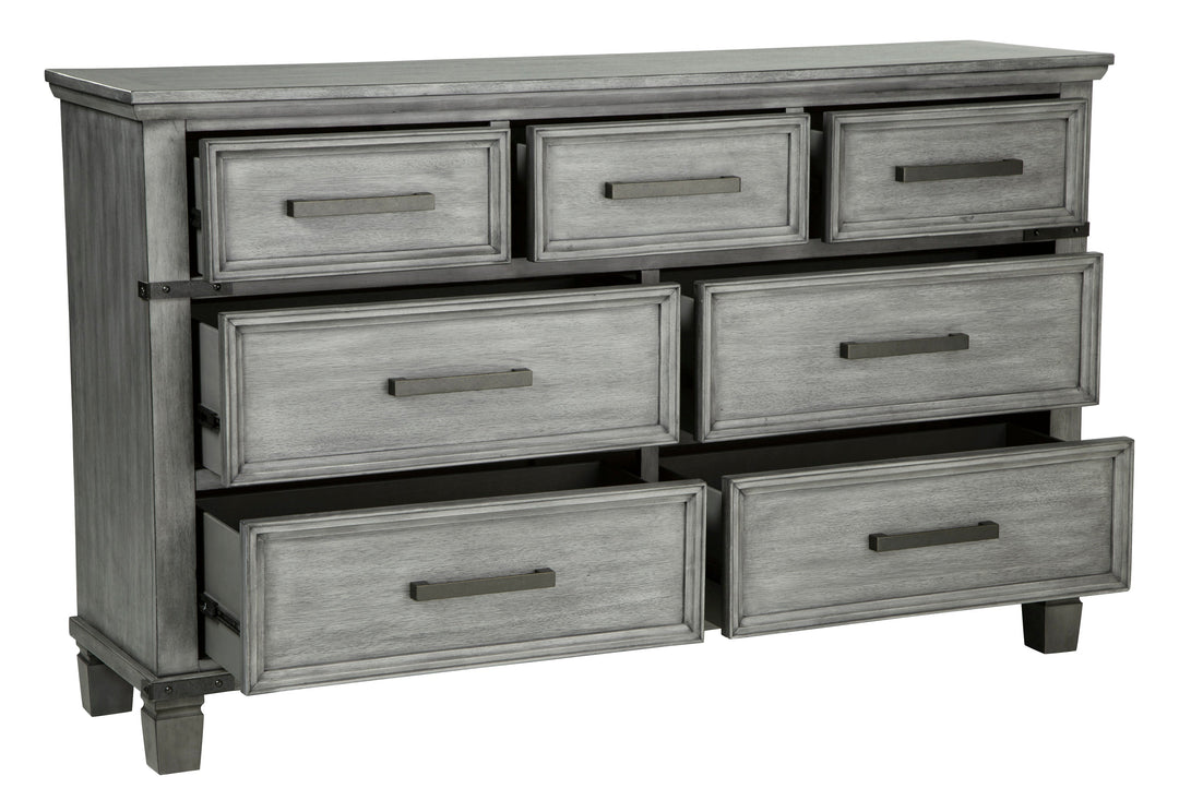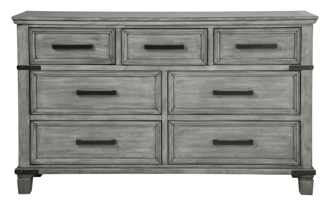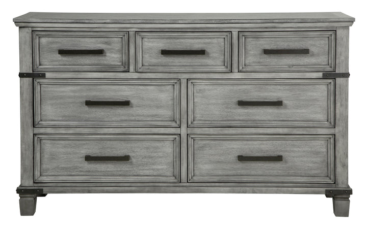 Dresser only;Made with acacia wood, acacia veneer and engineered wood;Light weathered gray finish;Metal accents and straps with aged bronze-tone finish;7 smooth-gliding drawers with dovetail construction