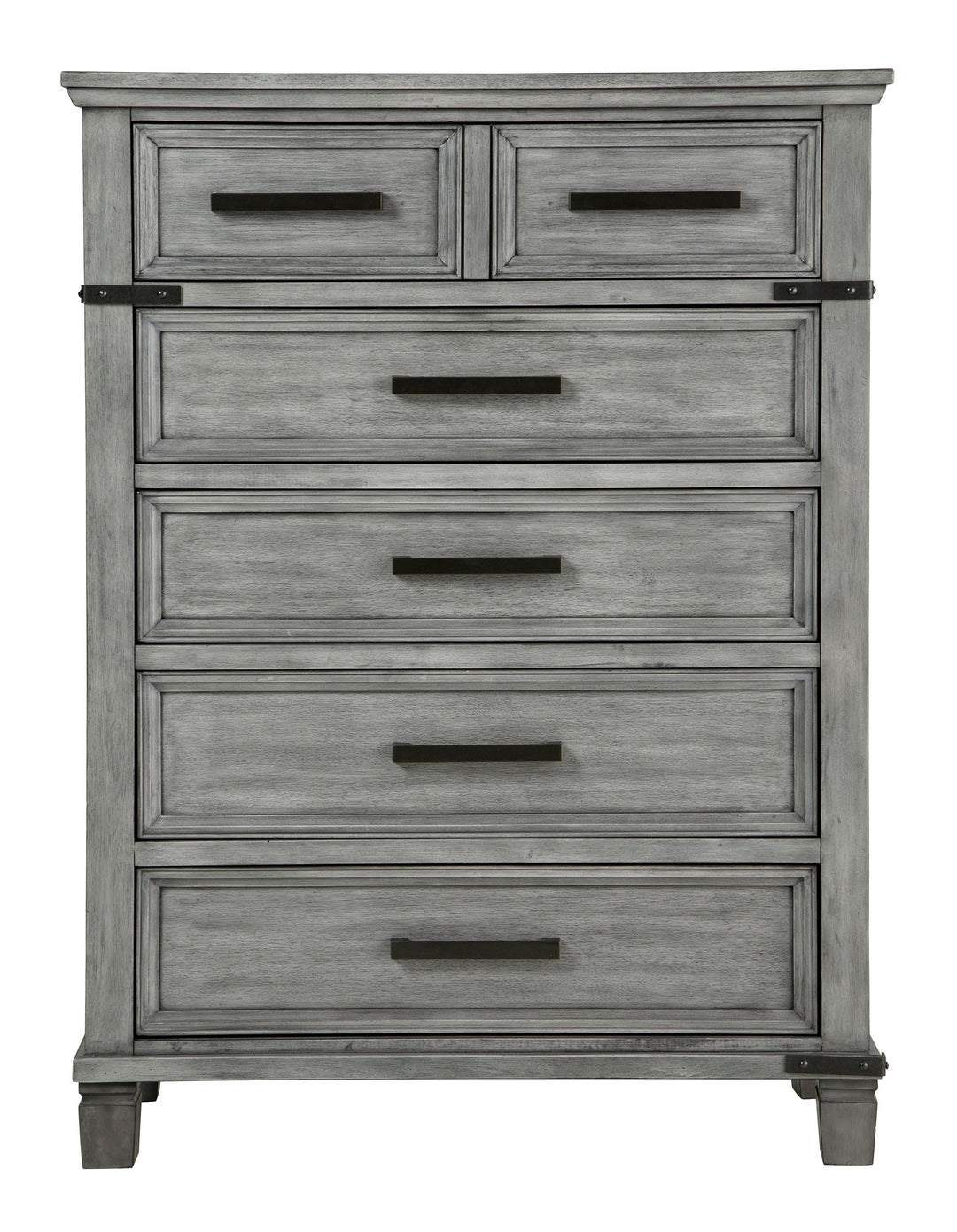 What's old is what's new with the Russelyn chest. Serving up a fresh look in urban farmhouse style, this eclectic piece features a light weathered gray finish with dark aged bronze-tone bar pulls and metal straps for a casually cool sensibility. Profiled drawer frames, thick-profiled top moulding and tapered legs are the earmarks of timeless design.