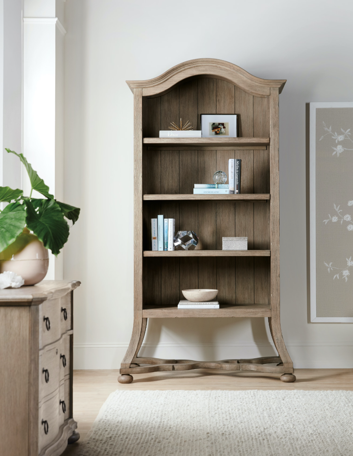 With a casual attitude and a sun-washed character inspired by the Mediterranean island for which it is named, the Corsica Bookcase is crafted of Acacia Veneers with a wire-brushed, artisan light natural finish with reclaimed character. Stylish details include an arched top trimmed in shaped crown molding, a planked back panel and a wavy X-stretcher connecting 4 bun feet. The bookcase has 3 adjustable/removable shelves and one fixed shelf for ample storage and display.