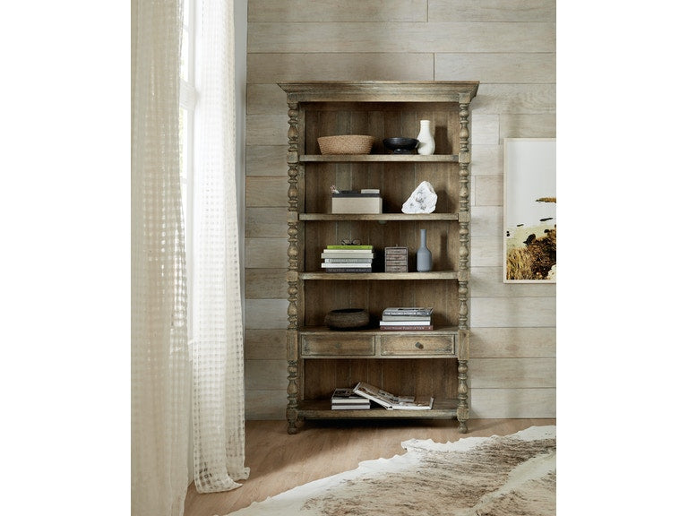 Infuse your room with authentic American character while bringing a practical storage and display piece to the kitchen, family room, hallway or bedroom with the Lyons Etagere. Distinguished by carved turnings running vertically from top to bottom on both sides, the Lyons is only 18 inches deep, letting you bring tight spaces to life with its handsome yet efficient vertical footprint. Finished in Washoff, a dry medium tone with distressing and hand plaining. Five fixed shelves and two drawers with gunmetal-colored knobs. Taking the next step in creating a Hill Country family of collections, Hooker Furniture has introduced LaGrange. The anthology of bedroom, living room, dining room, occasional and home office furniture is inspired by the Hill Country region of Texas, including the town of LaGrange, one of the stops made by the Hooker Furniture design team in search of inspiration. The collection includes heavily distressed oak and hickory surfaces, extensive carving and scroll work, aged metals, sedimentary stone and primitive textiles. Each piece has a unique story to tell, while still retaining the authentic American character of the original collection. LaGrange is updated with a fresh new personality, brought to life by four distinctive finishes and modern conveniences for the lifestyles of today.