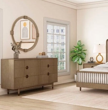 A scaled-down version of the Finn dresser, this bedside chest offers ample storage in a more compact footprint. Store all your essentials, from electronics to eyeglasses, inside three drawers with elm veneer and circular antique gold cutout pulls.