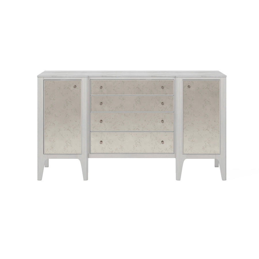 Introduce a little glamour to the dining room with this elegant dove gray buffet, including four central drawers flanked by a door on each side, that offers plenty of storage space for all your entertaining essentials. This piece also features a luxurious stone top and nickel hardware, as well as the antiqued mirror fronts that are the hallmark of this collection.