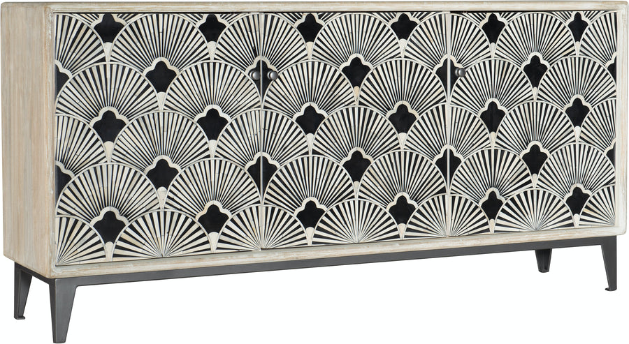 Contemporary and chic, this entertainment center combines natural materials and a classic black and white color scheme and shell motif to create a functional focal point. Crafted of Mango Wood with bone inlay, a natural wood finish on the outside of the case contrasts with black and white inlay on the door fronts and is complemented by a gray metal base and hardware and an off-white painted interior. There’s one removable shelf behind each door, a 3-plug electrical outlet, ventilated back panel and soft-close hinges on the doors.