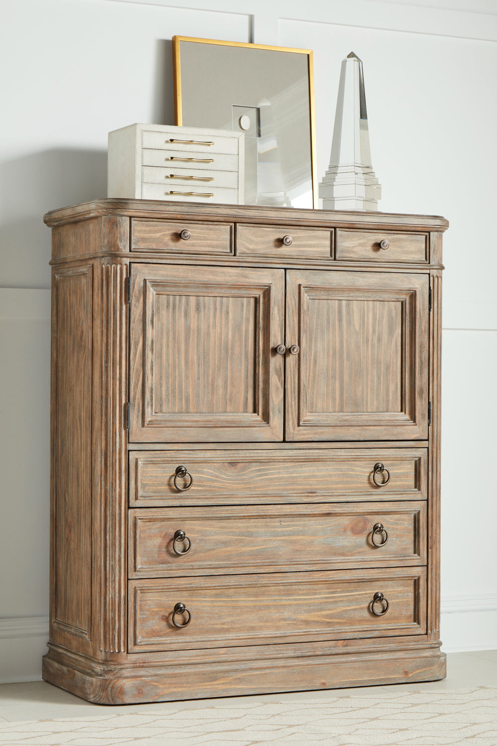 Storage options abound in this chest from the Architrave collection, combining six drawers with one tray drawer, and a lower drawer lined in aromatic cedar. The center storage area contains two adjustable shelves behind a pair of traditionally paneled doors. Measuring over 60-in tall, this combination chest is a striking addition to the bedroom setting. The wire-brushed rustic pine finish is complemented by the delicate patina of rubbed bronze hardware.