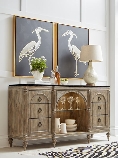 The striking design of the Architrave Server borrows details from 18-century neoclassical architecture, including a trio of arches and fluted Roman column details. The result is an eye-catching addition to any dining space, highlighted by interior touch-operated LED lighting and an adjustable glass shelf that showcases china and display items in a soft halo of light. A honed black stone top provides a touch of sophistication, balancing the casual rustic pine finish for a look that?s equal parts elegant and laidback.