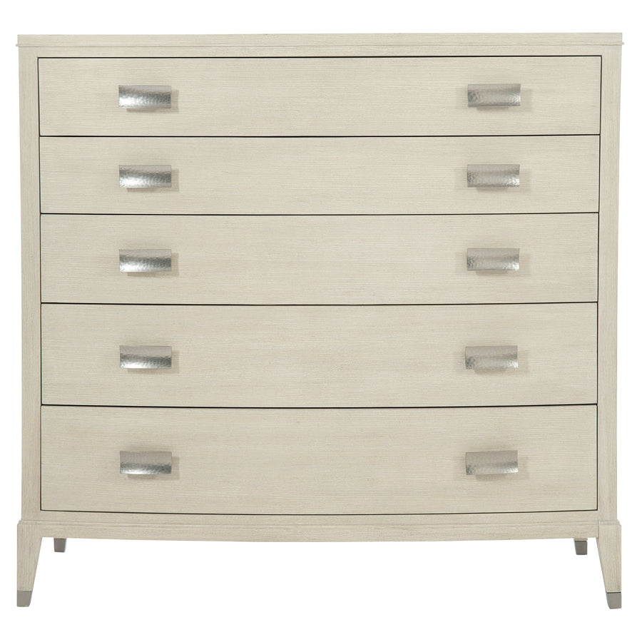 The East Hampton demilune console table radiates simplicity and style. Graceful curves and clean lines combine for a modern aesthetic inspired by traditional English design. Quartered ash veneers feature a Cerused Linen finish, created using light wire brushing and cerusing techniques to highlight the linear wood grain. Adding a hint of shine, a stainless steel base with slender tapered legs is finished in a lustrous Aged Silver. A bottom shelf offers additional space for display and storage.81.28x40.64x142.0876 HxDxW (cm)